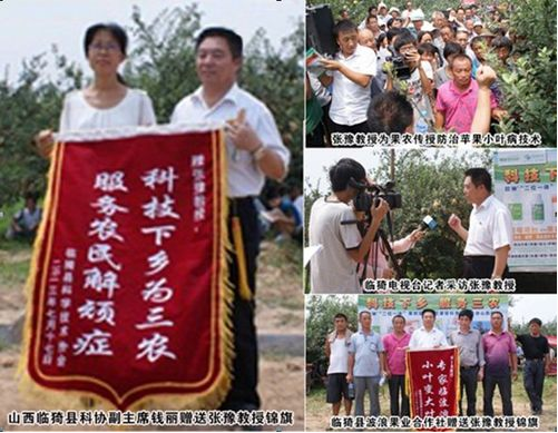 觀摩會現(xiàn)場,臨猗縣科學技術協(xié)會副主席錢麗代表縣科協(xié)為表彰以中國農(nóng)科院教授、上海漢和高級技術顧問張豫為技術骨干的農(nóng)化專家團對臨猗縣蘋果病害防治和科學管理做出的重大貢獻,授予專家團“科技下鄉(xiāng)為三農(nóng),服務農(nóng)民解頑癥”錦旗。臨猗縣波浪果業(yè)合作社為感謝專家團幫助本合作社果農(nóng)解決小葉病問題贈送了“專家臨波浪,小葉變大葉”的錦旗。