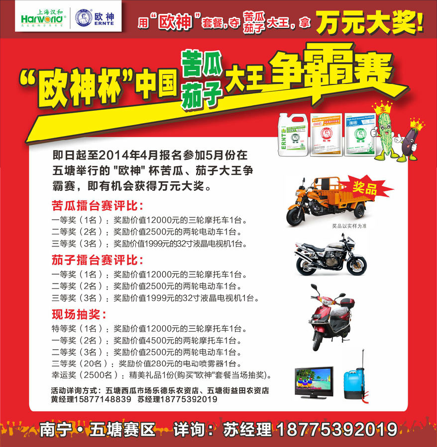 2014年3月23日“歐神杯”苦瓜茄子大王爭(zhēng)霸賽在中國(guó)苦瓜之鄉(xiāng)廣西南寧市五塘鎮(zhèn)正式啟動(dòng)!“用漢和‘歐神’套餐,奪苦瓜茄子大王,拿萬(wàn)元大獎(jiǎng)!”已經(jīng)成了在南寧五塘鎮(zhèn)家喻戶(hù)曉的口號(hào)!