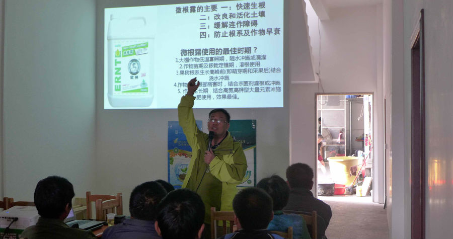 呂老師為果農(nóng)們講解了根部用“微根露+美加健”兌水淋根/葉面用“海培+微果露”噴施的“二位一體”黃化防控技術(shù),并展示了“二位一體”黃化防控技術(shù)在全國(guó)各地果園的成功案例,在場(chǎng)果農(nóng)聽后表示信心滿滿,相信有了漢和“二位一體”套餐肥的幫助,今年黃化不再來。