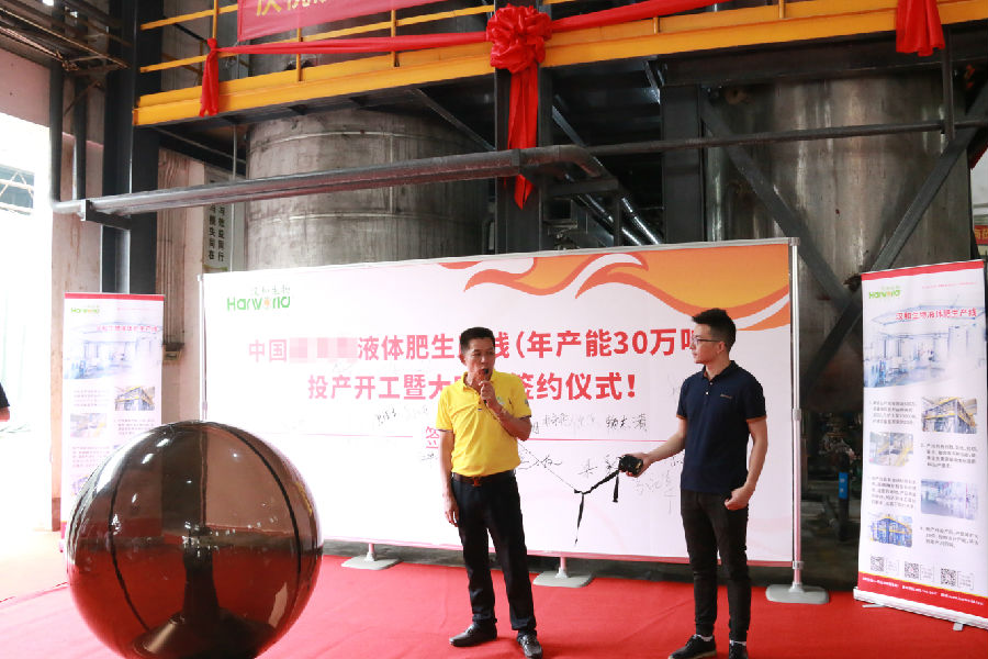 開機(jī)儀式正式開始,眾人按動水晶球,音樂伴隨著禮花應(yīng)聲響起,漢和30萬噸級液體肥生產(chǎn)線順利開工!