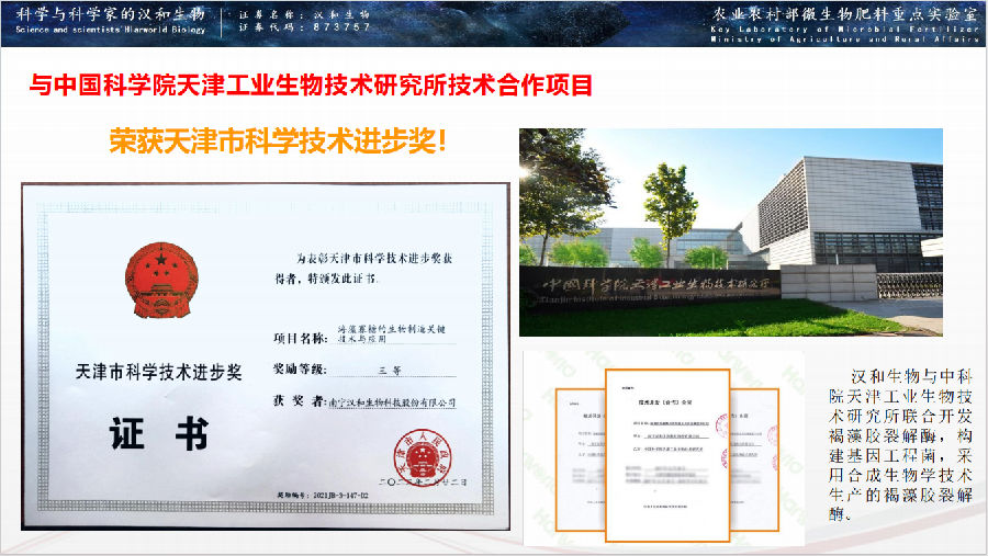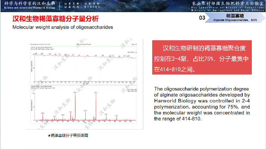 漢和生物與中國科學(xué)院天津工業(yè)生物技術(shù)研究所合作開發(fā)褐藻膠裂解酶,酶活達(dá)到500000u/ml,為全球最高水平,該項目榮獲“天津市科技進(jìn)步三等獎”。漢和生物運(yùn)用2.0版本新型雙功能褐藻膠裂解酶,制備高活性褐藻寡糖,分子量<1000(集中在414-828),液體褐藻寡糖含量做到30%(全球唯一)!參與起草褐藻寡糖(AOS)首個團(tuán)體標(biāo)準(zhǔn)(T/GXAF0013-2)。