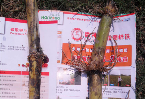 未使用的甘蔗根系與使用歐神產(chǎn)品的甘蔗根系做對(duì)比