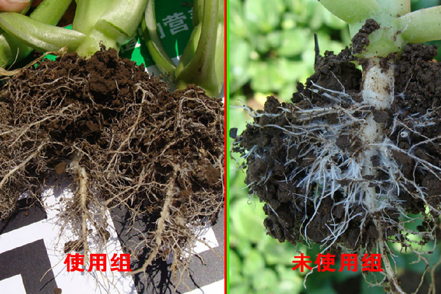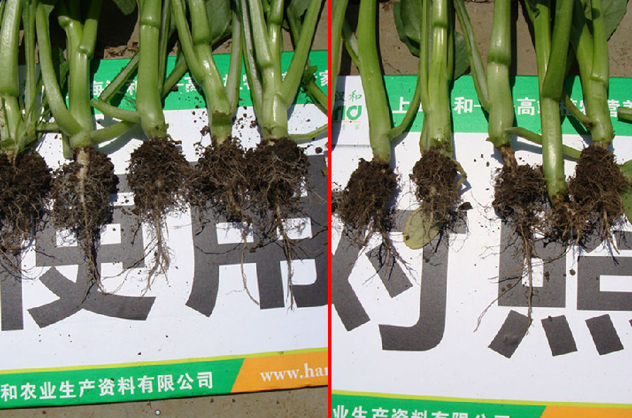 如圖11-12:使用漢和套餐的菜心,根系發(fā)達,白根多,根毛非常豐富,生長健壯,葉片厚實。