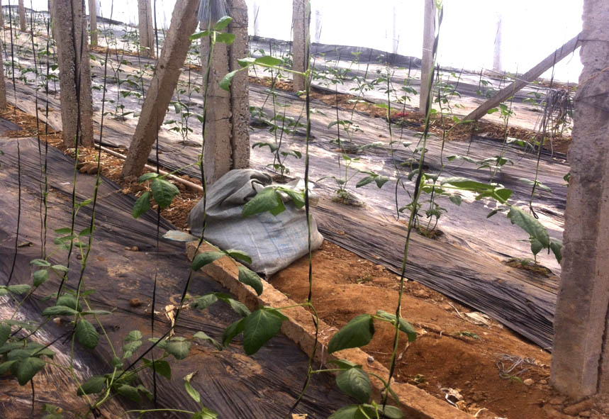 示范組合對照組的對比:實驗組豆角秧比對照組高,葉片大。