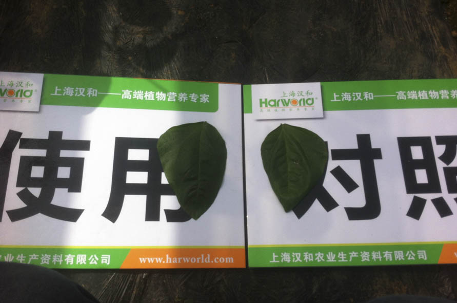 使用與對照的葉片差別:使用組葉片發(fā)黑而且大,對照組葉片小且有些黃。