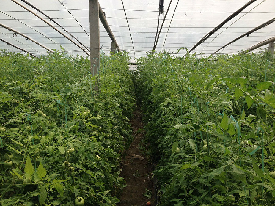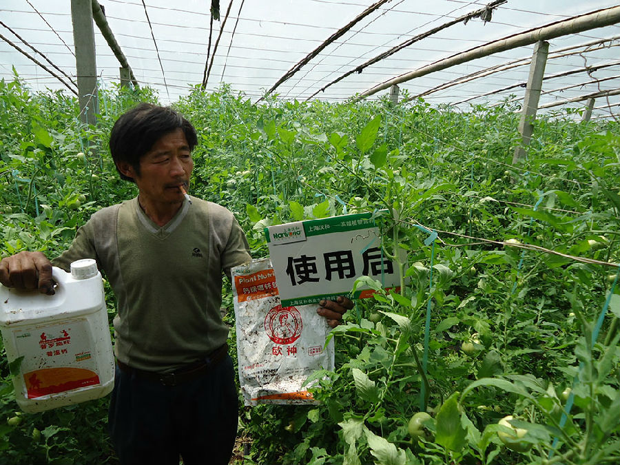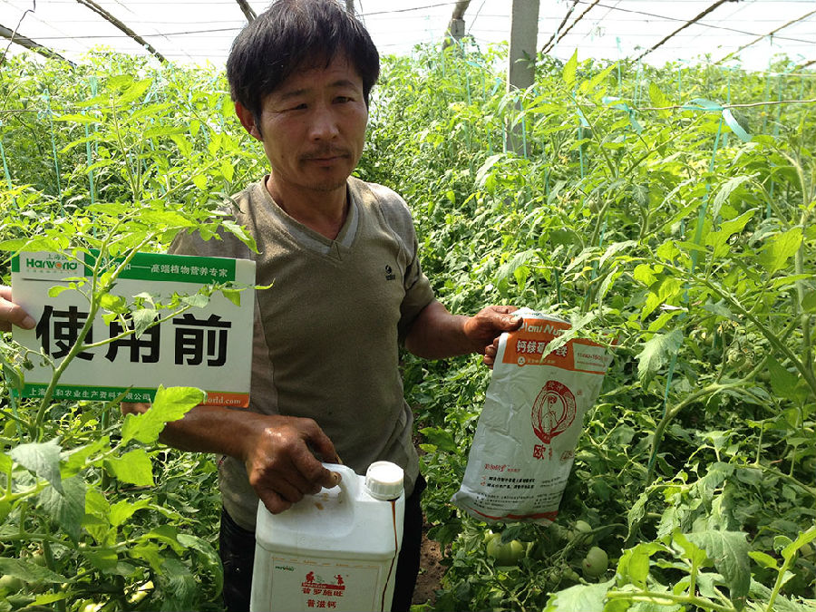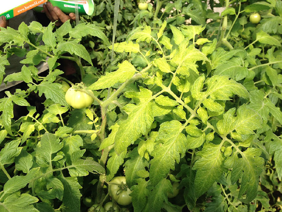 3月21日,我們在轉(zhuǎn)棚尋找示范戶和示范田的時候,突然發(fā)現(xiàn)這塊比較典型的缺鐵和缺鎂的缺素癥,同時也想通過這次試驗驗證普滋鈣在果實膨果上的效果,然后就確定了做示范試驗。
