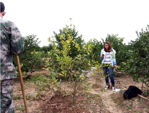 2016年5月27日,種植戶黃秀余參與對(duì)該株黃化樹的灌根處理: 100ml歐神微生物菌劑兌水10kg灌根。當(dāng)天該黃化植株全株葉片輕微黃化,樹勢(shì)弱,存在落葉、爛根情況,F(xiàn)場(chǎng)照片如下: