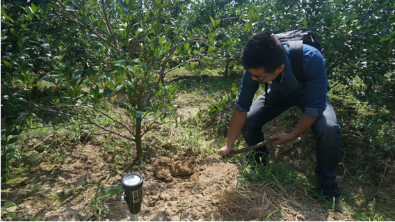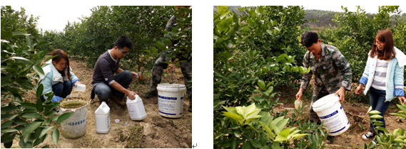 2016年2月20日,種植戶劉仕平(照片中著迷彩服)正在進(jìn)行春肥埋施,按照其習(xí)慣埋施復(fù)合肥和花生麩,外加50g歐神美加健。埋肥后其親自參與對(duì)該株黃化樹的灌根處理:50ml歐神微根露+100ml歐神微生物菌劑兌水10kg灌根。當(dāng)天該黃化植株全株葉片嚴(yán)重黃化,大量落葉,根系腐爛,F(xiàn)場(chǎng)照片如下: