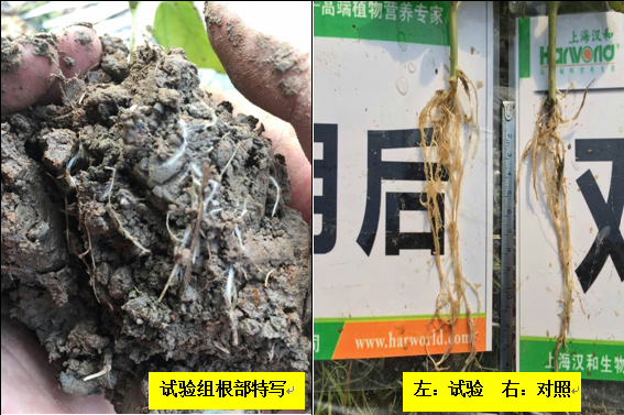 效果說明:滴灌微根露+微生物菌劑9天后,相比對(duì)照,試驗(yàn)組根系明顯更加健壯有力,白根多,根毛旺盛。并且可見有益菌成功定植,菌絲著生在根系表面。