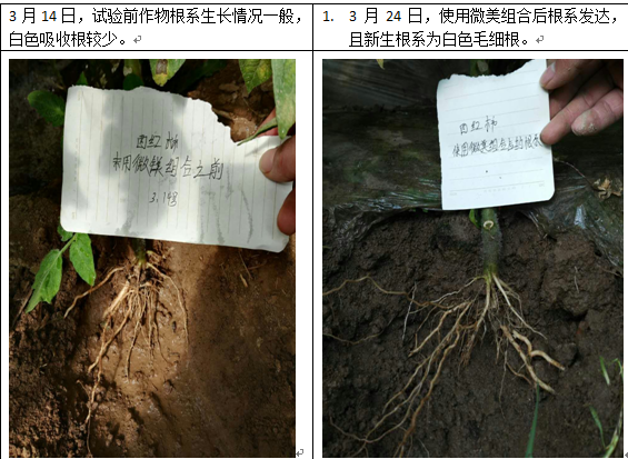 在西紅柿花期,稀釋2000倍沖施微根露6.25kg/畝+美加健2.5kg/畝,具有以下效果: