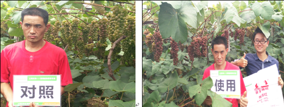 農(nóng)戶評(píng)價(jià)“:今年雨水多,病害多,霜霉病也嚴(yán)重,普遍上色困難,比起其他家的,使用普滋紅后的葡萄品質(zhì)好,著色快又均勻,效果我們很滿意!”