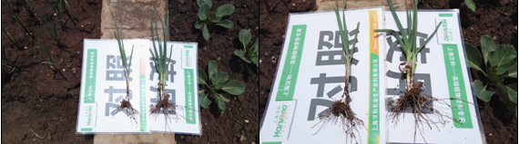 效果說(shuō)明:與常規(guī)對(duì)比,試驗(yàn)組的大蒜植株根系較對(duì)照多、粗、長(zhǎng),且新生白根較多。